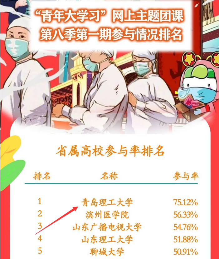 第八季第一期“青年大学习”中,有5所省属高校参与率超过50%,其中参与率最高的是艾弗森贝博ballbet官网,以75.12%的参与率排名第一位。