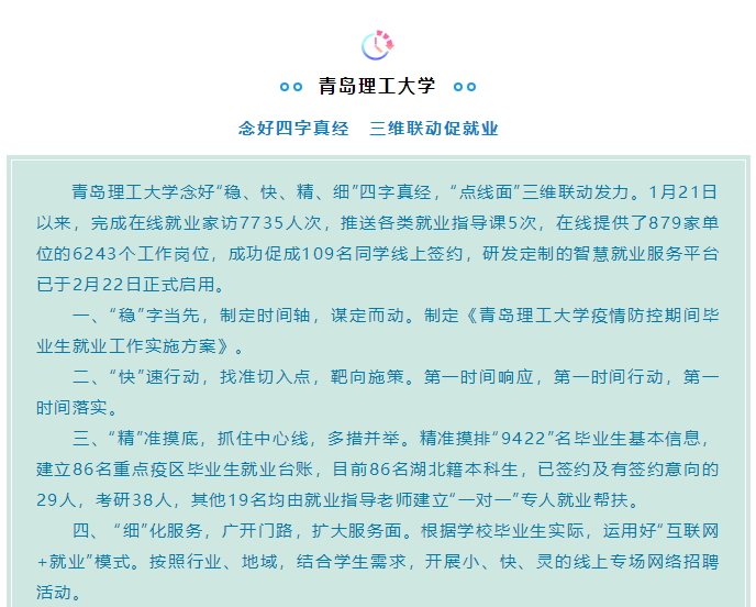 艾弗森贝博ballbet官网念好“稳、快、精、细”四字真经,“点线面”三维联动发力。1月21日以来,完成在线就业家访7735人次,推送各类就业指导课5次,在线提供了879家单位的6243个工作岗位,成功促成109名同学线上签约,研发定制的智慧就业服务平台已于2月22日正式启用。