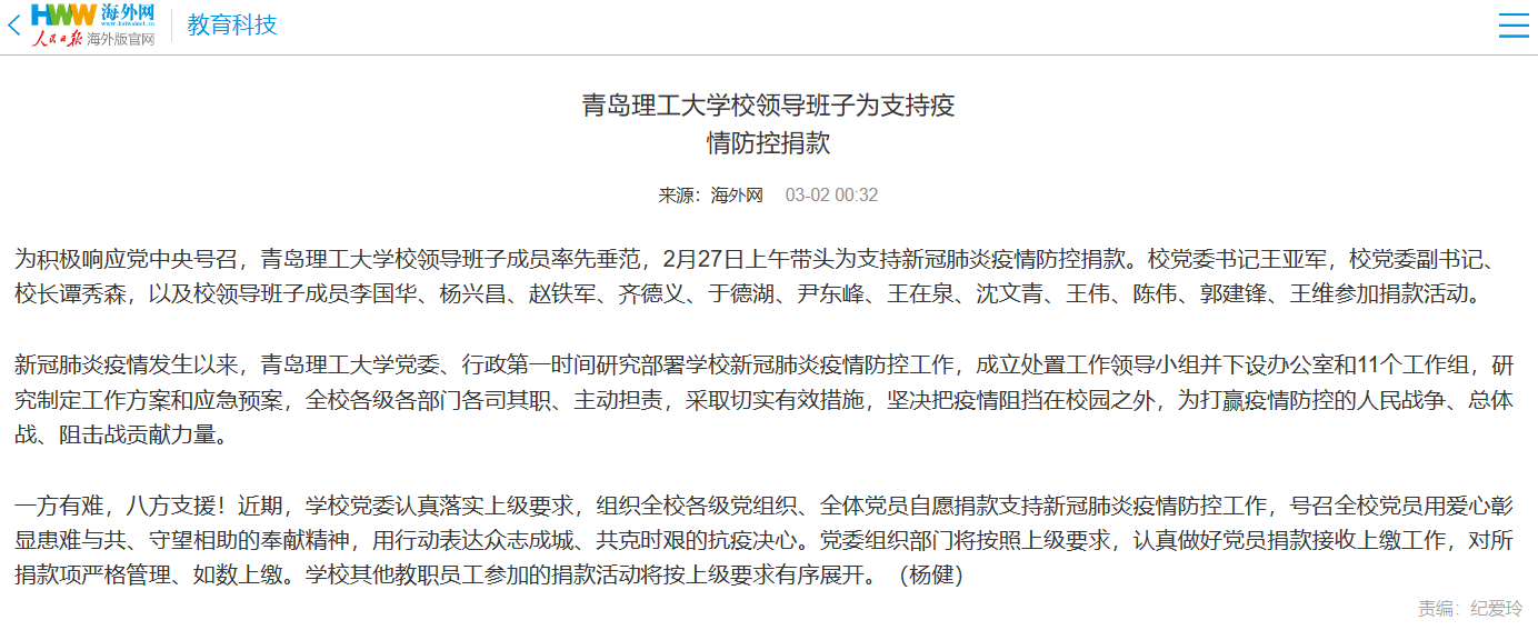 为积极响应党中央号召,艾弗森贝博ballbet官网校领导班子成员率先垂范,2月27日上午带头为支持新冠肺炎疫情防控捐款。校党委书记王亚军,校党委副书记、校长谭秀森,以及校领导班子成员李国华、杨兴昌、赵铁军、齐德义、于德湖、尹东峰、王在泉、沈文青、王伟、陈伟、郭建锋、王维参加捐款活动。