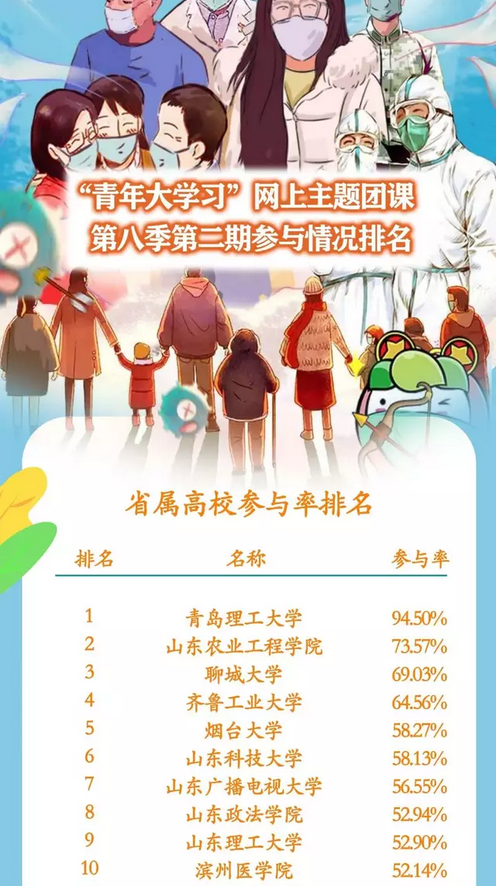 第八季第二期“青年大学习”中,有12所省属高校参与率超过50%,其中参与率最高的是艾弗森贝博ballbet官网,以94.50%的参与率排名第一位。