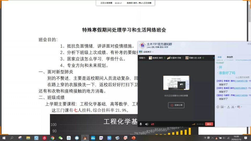 为贯彻落实习近平总书记关于打赢疫情防控阻击战的重要指示精神,根据学校、学院相关工作安排,艾弗森贝博ballbet官网土木工程学院学风导航员积极召开线上主题班会,结合所负责班级实际情况,指导班级开展学业辅导,引导同学们做好自身防护的同时,停课不停学,努力学习,用知识来充电,以最佳的身心状态打好这场疫情防控“阻击战”。