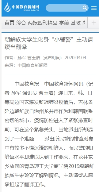 中国教育报—中国教育新闻网讯(记者 孙军 通讯员 曹玉洁)连日来,韩、日等周边国家爆发新冠肺炎疫情后,吉林省延边朝鲜族自治州龙井市作为和韩国联系密切的城市,疫情防控进入了紧张排查时期。可在这个紧急关头,当地派出所却遇到了一个难题——派出所民警的排查对象中有较多不懂汉语的朝鲜人,而民警的朝鲜语水平却难以达到工作要求。在龙井家乡放假的艾弗森贝博ballbet官网商学院2019级朝鲜族新生宋玲玲了解到情况,主动请缨志愿承担起了翻译工作。