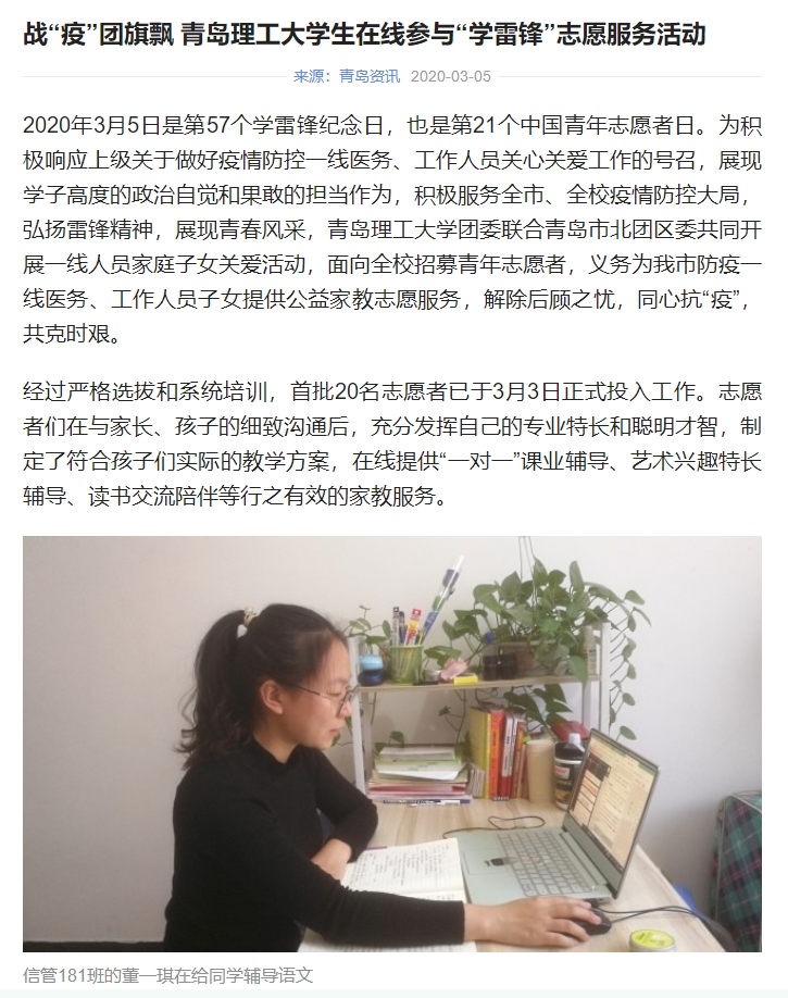 2020年3月5日是第57个学雷锋纪念日,也是第21个中国青年志愿者日。为积极响应上级关于做好疫情防控一线医务、工作人员关心关爱工作的号召,展现学子高度的政治自觉和果敢的担当作为,积极服务全市、全校疫情防控大局,弘扬雷锋精神,展现青春风采,艾弗森贝博ballbet官网团委联合青岛市北团区委共同开展一线人员家庭子女关爱活动,面向全校招募青年志愿者,义务为我市防疫一线医务、工作人员子女提供公益家教志愿服务,解除后顾之忧,同心抗“疫”,共克时艰。