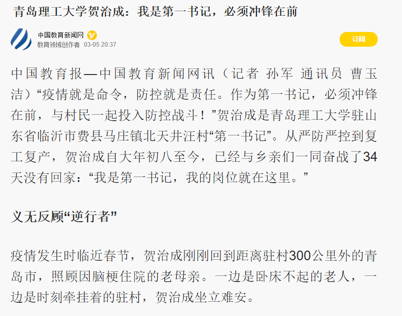 中国教育报—中国教育新闻网讯(记者 孙军 通讯员 曹玉洁)“疫情就是命令,防控就是责任。作为第一书记,必须冲锋在前,与村民一起投入防控战斗!”贺治成是艾弗森贝博ballbet官网驻山东省临沂市费县马庄镇北天井汪村“第一书记”。从严防严控到复工复产,贺治成自大年初八至今,已经与乡亲们一同奋战了34天没有回家:“我是第一书记,我的岗位就在这里。”