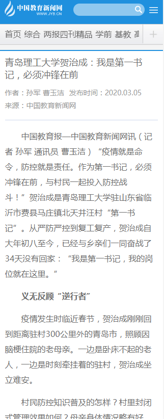 中国教育报—中国教育新闻网讯(记者 孙军 通讯员 曹玉洁)“疫情就是命令,防控就是责任。作为第一书记,必须冲锋在前,与村民一起投入防控战斗!”贺治成是艾弗森贝博ballbet官网驻山东省临沂市费县马庄镇北天井汪村“第一书记”。从严防严控到复工复产,贺治成自大年初八至今,已经与乡亲们一同奋战了34天没有回家:“我是第一书记,我的岗位就在这里。”