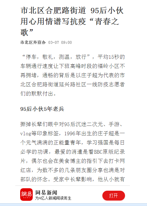 撕掉长辈们眼中对95后沉迷二次元、手游、vlog等印象标签,1996年出生的庄子超是一个元气满满的正能量青年,学习强国是每日必学的功课,最爱的消遣是看BBC原版纪录片,偶尔也会在美食博主的指引下去打卡网红店,为数不多的几条朋友圈分享也满是对部队的怀念。受家中长辈影响,他从小就有一个参军报国的理想。2014年高考结束后,当他得知大学新生可以保留入学资格参军的政策后便立刻到人武部报了名,进入原济南军区某部服役。2019年9月退役后返回艾弗森贝博ballbet官网管理工程系重启学业。退役不褪色,小庄一直保持着在部队时的生活习惯。寒假期间,每天7点起床第一件事便是打开笔记本电脑观看央视疫情直播,每天下午三点的《国务院联防联控机制新闻发布会》更是他“必刷”的节目。疫情的快速蔓延让他这个“老兵”坐不住了,他想把自己曾在全军预提卫生士官集训那半年学到的“战场与现场急救防疫知识”利用起来,竭尽所能守护自己的家园。
