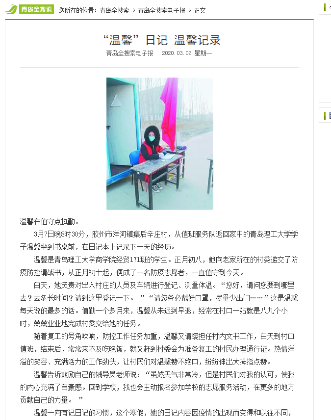 温馨告诉鼓励自己的辅导员老师说:“虽然天气非常冷,但是村民们对我的认可,使我的内心充满了自豪感。回到学校,我也会主动报名参加学校的志愿服务活动,在更多的地方贡献自己的力量。 ”
