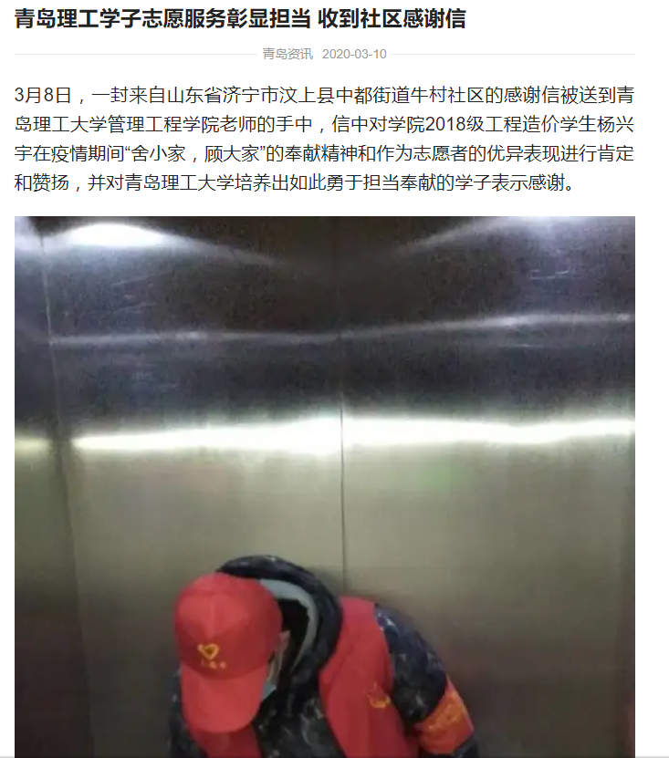 3月8日,一封来自山东省济宁市汶上县中都街道牛村社区的感谢信被送到艾弗森贝博ballbet官网管理工程学院老师的手中,信中对学院2018级工程造价学生杨兴宇在疫情期间“舍小家,顾大家”的奉献精神和作为志愿者的优异表现进行肯定和赞扬,并对艾弗森贝博ballbet官网培养出如此勇于担当奉献的学子表示感谢。