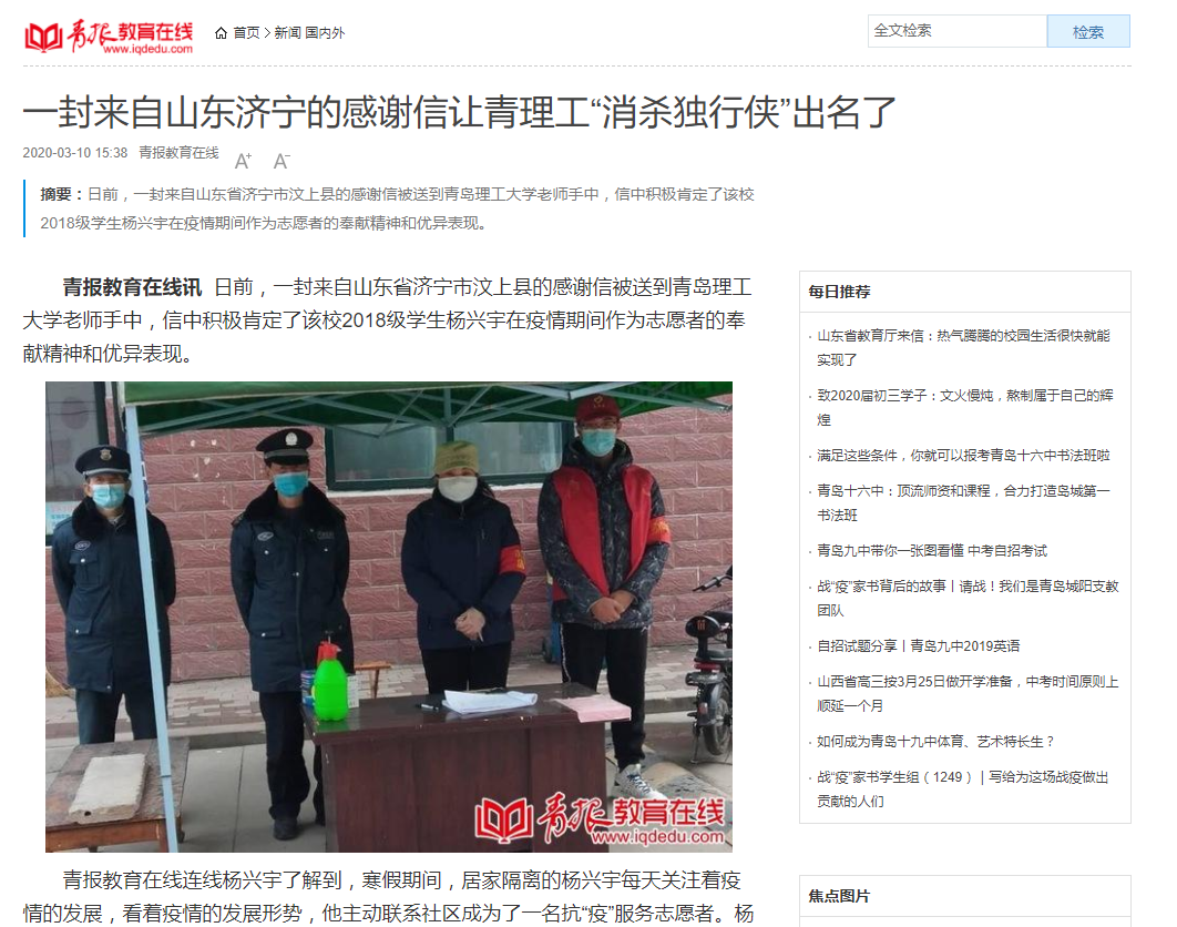青报教育在线讯日前,一封来自山东省济宁市汶上县的感谢信被送到艾弗森贝博ballbet官网老师手中,信中积极肯定了该校2018级学生杨兴宇在疫情期间作为志愿者的奉献精神和优异表现。