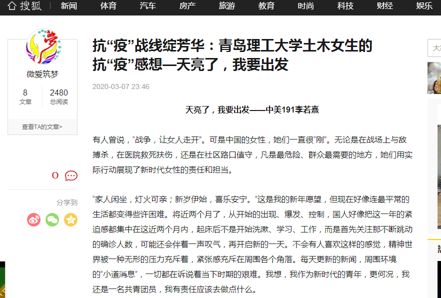 “家人闲坐,灯火可亲;新岁伊始,喜乐安宁。”这是我的新年愿望,但现在好像连最平常的生活都变得些许困难。将近两个月了,从开始的出现、爆发、控制,国人好像把这一年的紧迫感都集中在这近两个月内,起床后不是开始洗漱、学习、工作,而是首先关注那不断跳动的确诊人数,可能还会伴着一声叹气,再开启新的一天。不会有人喜欢这样的感觉,精神世界被一种无形的压力充斥着,紧张感充斥在周围各个角落。每天更新的新闻,周围环境的“小道消息”,一切都在诉说着当下时期的艰难。我想,我作为新时代的青年,更何况,我还是一名共青团员,我有责任应该去做点什么。