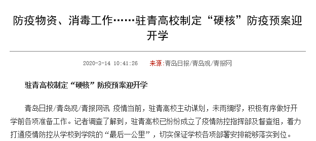疫情当前,驻青高校主动谋划,未雨绸缪,积极有序做好开学前各项准备工作。记者调查了解到,驻青高校已纷纷成立了疫情防控指挥部及督查组,着力打通疫情防控从学校到学院的“最后一公里”,切实保证学校各项部署安排能够落实到位。