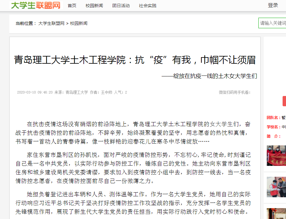 “大姨,您是哪个村的啊?现在疫情严重,亲戚之间不能串门的。”这是山东省潍坊市东夏镇官宅村的赵美霞每天说的做多的话之一。在村口检查来往车辆,记录来往人员信息,进行体温检测的几个环节都能看见她的身影。在村里广播征集守村志愿者时,每天上网关注疫情的她也按耐不住了,当即向村委会请缨愿为疫情工作献出自己的一份力。由于农村防范意识相对较差,空闲时,她会配合村委去村中各户进行安全知识普及,向村民讲解有关新型冠状病毒的传染性,以及预防措施。她说:“作为一名共青团员,为村民的安全献出自己的一份绵薄之力,增强科学防范意识,不仅是我们的义务,也是我们青春的底色。”