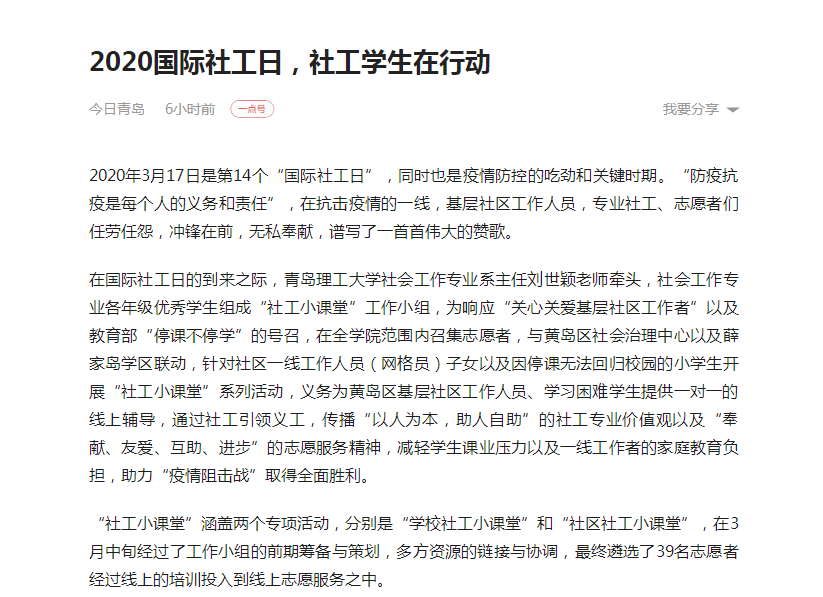 在国际社工日的到来之际,艾弗森贝博ballbet官网社会工作专业系主任刘世颖老师牵头,社会工作专业各年级优秀学生组成“社工小课堂”工作小组,为响应“关心关爱基层社区工作者”以及教育部“停课不停学”的号召,在全学院范围内召集志愿者,与黄岛区社会治理中心以及薛家岛学区联动,针对社区一线工作人员(网格员)子女以及因停课无法回归校园的小学生开展“社工小课堂”系列活动,义务为黄岛区基层社区工作人员、学习困难学生提供一对一的线上辅导,通过社工引领义工,传播“以人为本,助人自助”的社工专业价值观以及“奉献、友爱、互助、进步”的志愿服务精神,减轻学生课业压力以及一线工作者的家庭教育负担,助力“疫情阻击战”取得全面胜利。