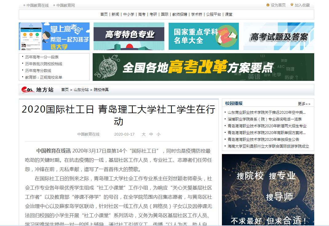 中国教育在线讯2020年3月17日是第14个“国际社工日”,同时也是疫情防控最吃劲的关键时期。在抗击疫情的一线,基层社区工作人员,专业社工、志愿者们任劳任怨,冲锋在前,无私奉献,谱写了一首首伟大的赞歌。