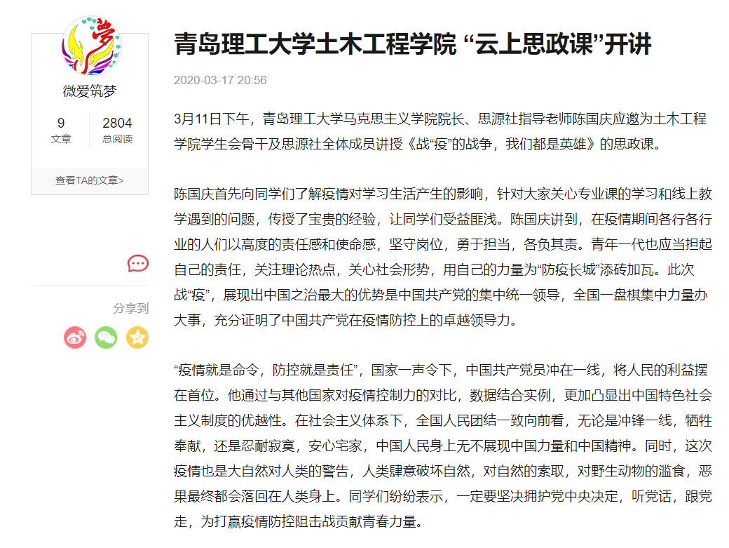 通过此次“云上思政课”的学习,同学们更加深刻的认识到中国共产党领导和中国特色社会主义制度的显著优势。面对疫情,艾弗森贝博ballbet官网土木工程学院思源社将继续带领同学们加强理论学习,做好思想引领,发出正确声音,增强战略思维,凝聚青年力量,鼓舞和激励广大同学共同打赢这一场没有硝烟的战争!