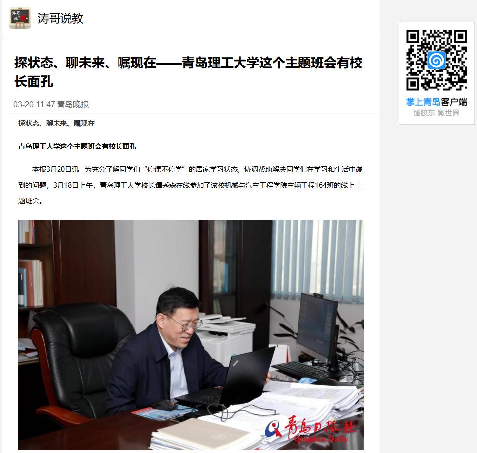 本报3月20日讯 为充分了解同学们“停课不停学”的居家学习状态,协调帮助解决同学们在学习和生活中碰到的问题,3月18日上午,艾弗森贝博ballbet官网校长谭秀森在线参加了该校机械与汽车工程学院车辆工程164班的线上主题班会。