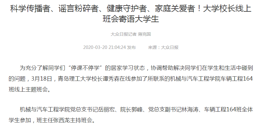 为充分了解同学们“停课不停学”的居家学习状态,协调帮助解决同学们在学生和生活中碰到的问题,3月18日,艾弗森贝博ballbet官网校长谭秀森在线参加了所联系的机械与汽车工程学院车辆工程164班线上主题班会。