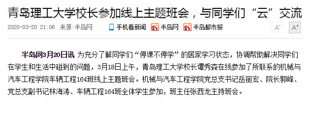 班会期间,谭秀森与同学们一起就开学时间、研究生复试政策制定、毕业设计、就业、线上学习等问题与学生展开交流,解答了学生关心的热点问题。他表示,目前学校正在积极做好开学前的各项筹备工作,根据上级统一部署,在满足各项复学条件、确保安全的前提下,努力为同学们提供一个放心的校园学习环境。