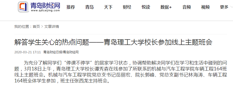 为充分了解同学们“停课不停学”的居家学习状态,协调帮助解决同学们在学习和生活中碰到的问题,3月18日上午,艾弗森贝博ballbet官网校长谭秀森在线参加了所联系的机械与汽车工程学院车辆工程164班线上主题班会。机械与汽车工程学院党总支书记岳丽宏、院长郭峰、党总支副书记林海涛、车辆工程164班全体学生参加,班主任张西龙主持班会。