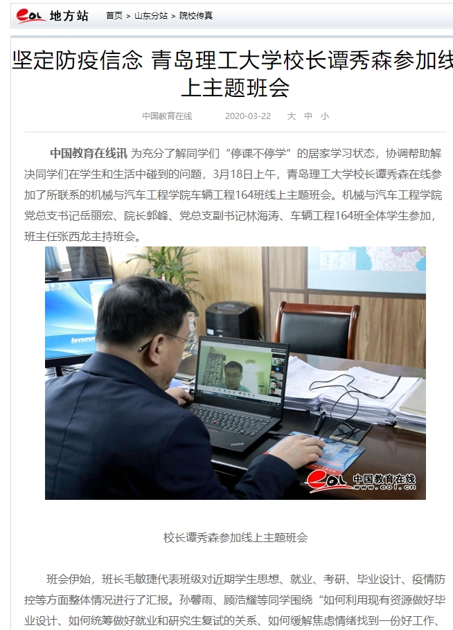 中国教育在线讯为充分了解同学们“停课不停学”的居家学习状态,协调帮助解决同学们在学生和生活中碰到的问题,3月18日上午,艾弗森贝博ballbet官网校长谭秀森在线参加了所联系的机械与汽车工程学院车辆工程164班线上主题班会。机械与汽车工程学院党总支书记岳丽宏、院长郭峰、党总支副书记林海涛、车辆工程164班全体学生参加,班主任张西龙主持班会。