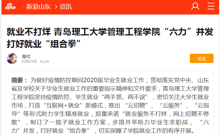 为做好疫情防控期间2020届毕业生就业工作,贯彻落实党中央、山东省及学校关于毕业生就业工作的重要指示精神和文件要求,艾弗森贝博ballbet官网管理工程学院坚持疫情防控、学生就业“两手抓、两不误”,密切关注大学生就业市场,打造“互联网+就业”新模式,推出 “云招聘”、“云服务”、“云指导”等形式助力学生精准就业,郑重承诺“就业服务不打烊,网上招聘不停歇”,制订了一揽子就业工作方案,多措并举助力毕业生求职战, “六力”并发,打好就业“组合拳”,切实保障了学院就业工作的有序开展。