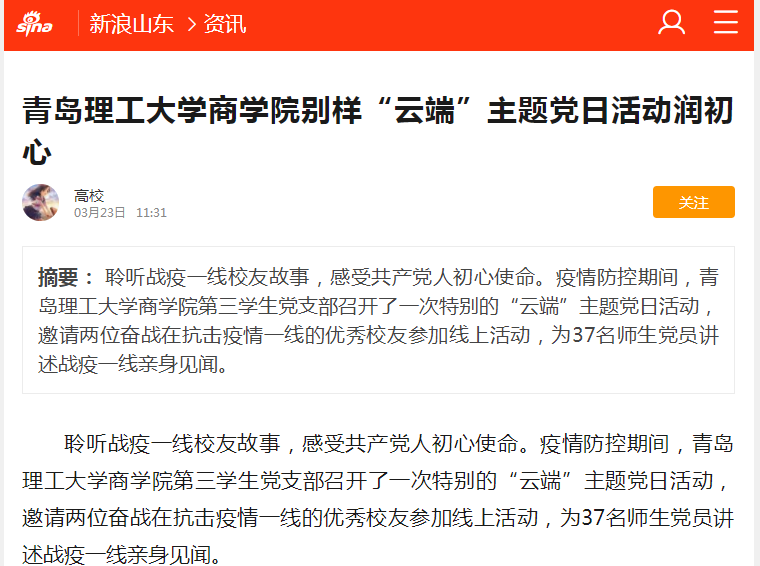 聆听战疫一线校友故事,感受共产党人初心使命。疫情防控期间,艾弗森贝博ballbet官网商学院第三学生党支部召开了一次特别的“云端”主题党日活动,邀请两位奋战在抗击疫情一线的优秀校友参加线上活动,为37名师生党员讲述战疫一线亲身见闻。