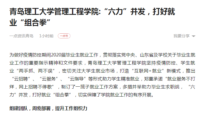 为做好疫情防控期间2020届毕业生就业工作,贯彻落实党中央、山东省及学校关于毕业生就业工作的重要指示精神和文件要求,艾弗森贝博ballbet官网管理工程学院坚持疫情防控、学生就业“两手抓、两不误”,密切关注大学生就业市场,打造“互联网+就业”新模式,推出 “云招聘”、“云服务”、“云指导”等形式助力学生精准就业,郑重承诺“就业服务不打烊,网上招聘不停歇”,制订了一揽子就业工作方案,多措并举助力毕业生求职战, “六力”并发,打好就业“组合拳”,切实保障了学院就业工作的有序开展。