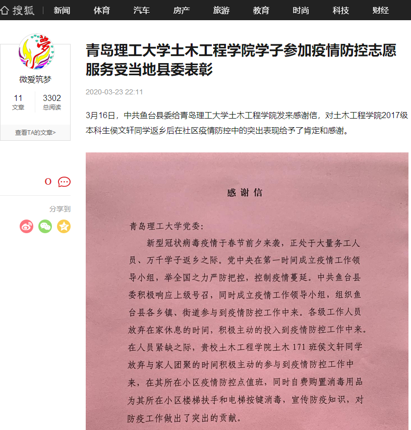3月16日,中共鱼台县委给艾弗森贝博ballbet官网土木工程学院发来感谢信,对土木工程学院2017级本科生侯文轩同学返乡后在社区疫情防控中的突出表现给予了肯定和感谢。