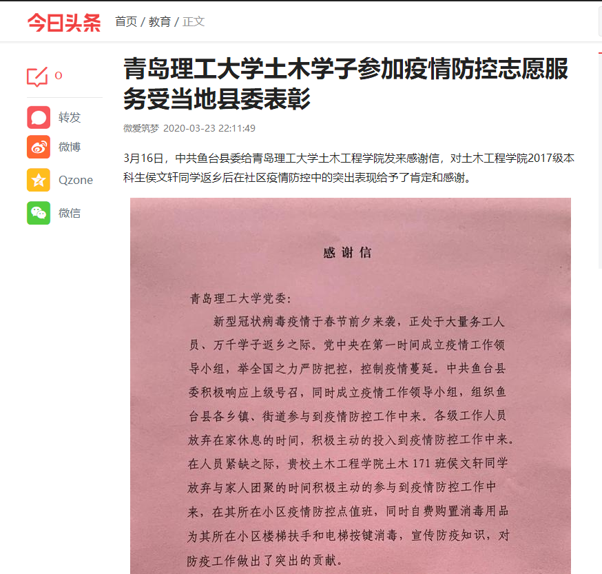 3月16日,中共鱼台县委给艾弗森贝博ballbet官网土木工程学院发来感谢信,对土木工程学院2017级本科生侯文轩同学返乡后在社区疫情防控中的突出表现给予了肯定和感谢。