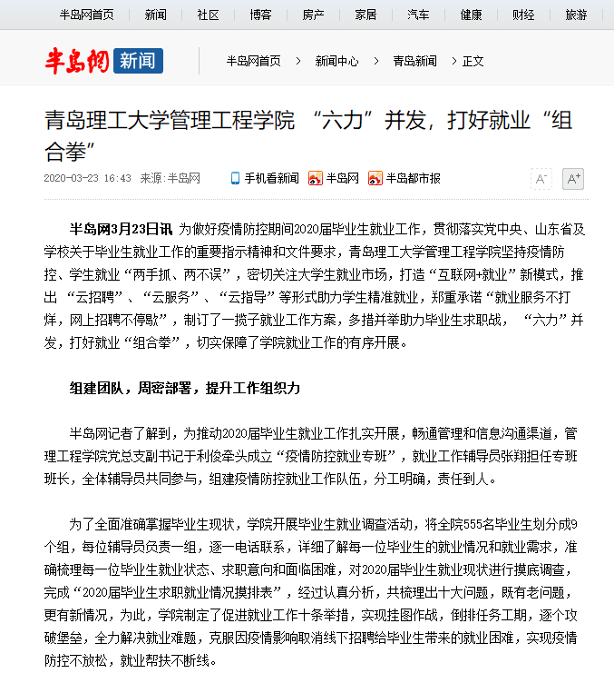 为做好疫情防控期间2020届毕业生就业工作,贯彻落实党中央、山东省及学校关于毕业生就业工作的重要指示精神和文件要求,艾弗森贝博ballbet官网管理工程学院坚持疫情防控、学生就业“两手抓、两不误”,密切关注大学生就业市场,打造“互联网+就业”新模式,推出 “云招聘”、“云服务”、“云指导”等形式助力学生精准就业,郑重承诺“就业服务不打烊,网上招聘不停歇”,制订了一揽子就业工作方案,多措并举助力毕业生求职战, “六力”并发,打好就业“组合拳”,切实保障了学院就业工作的有序开展。