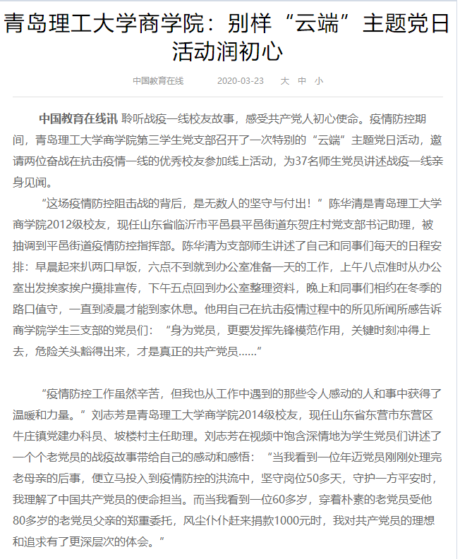 聆听战疫一线校友故事,感受共产党人初心使命。疫情防控期间,艾弗森贝博ballbet官网商学院第三学生党支部召开了一次特别的“云端”主题党日活动,邀请两位奋战在抗击疫情一线的优秀校友参加线上活动,为37名师生党员讲述战疫一线亲身见闻。