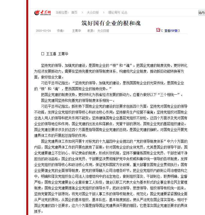 习近平总书记指出:“坚持党的领导、加强党的建设,是我国国有企业的光荣传统,是国有企业的‘根’和‘魂’,是我国国有企业的独特优势。”