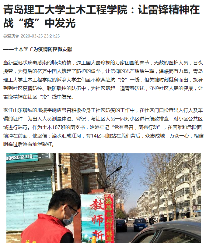 艾弗森贝博ballbet官网土木工程学院学子们为战“疫”胜利坚守岗位、奉献自我。这一刻,他们就是雷锋精神的时代传承人。大写的青春里应有大写的家国情怀,要让青春走出孤芳自赏的小我,把自己的小我融入祖国的大我,人民的大我,与时代同步伐、与人民共命运。要把雷锋精神融入血液践于行动,从点滴做起,从小事做起,传递正能量,一直与疫情战斗下去,直到胜利那一天,让雷锋精神在战“疫”中发光!