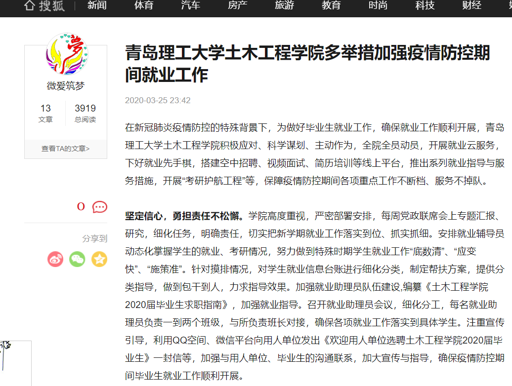 科学谋划,创新方式求突破。突如其来的疫情扰乱了用人单位的招聘安排,就业辅导员积极与用人单位联系,了解用人单位的招聘计划,开展云招聘活动。通过学院就业信息网、微信公众号等平台,为毕业生提供招聘信息、就业指导、职业规划等方面的内容;做好用人单位与毕业生的供需对接工作,为广大用人单位和毕业生继续提供精准服务。学院还开启空中招聘平台,全面加强与完善校园空中招聘服务平台等专业机构的合作,举办空中宣讲会和网络视频招聘会,积极邀请用人单位参加在线宣讲、互动答疑和视频面试,毕业生通过PC或手机等终端即可参加用人单位“云宣讲”,实时用文字与用人单位进行互动。截止目前已有恒大地产、中建三局、洲宇设计等40余家知名建筑及相关企业在学院进行网络春招,建立学院2020届毕业生用人单位招聘信息数据库。疫情期间,向毕业生推送74家招聘单位、2700余就业岗位。
