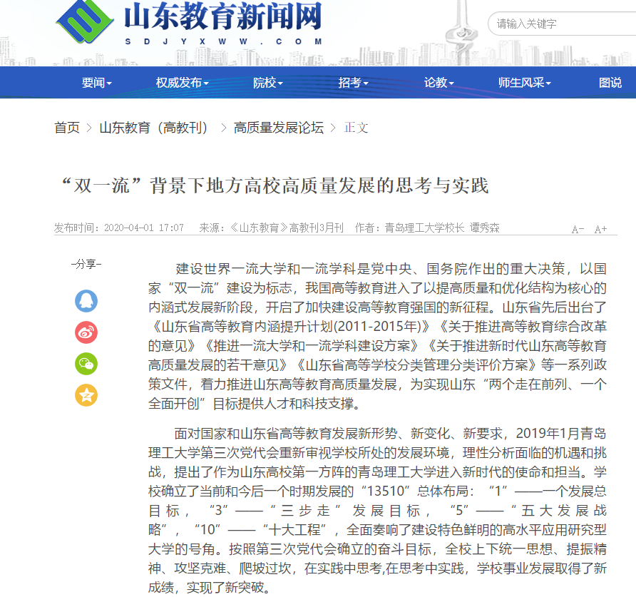 建设世界一流大学和一流学科是党中央、国务院作出的重大决策,以国家“双一流”建设为标志,我国高等教育进入了以提高质量和优化结构为核心的内涵式发展新阶段,开启了加快建设高等教育强国的新征程。山东省先后出台了《山东省高等教育内涵提升计划(2011-2015年)》《关于推进高等教育综合改革的意见》《推进一流大学和一流学科建设方案》《关于推进新时代山东高等教育高质量发展的若干意见》《山东省高等学校分类管理分类评价方案》等一系列政策文件,着力推进山东高等教育高质量发展,为实现山东“两个走在前列、一个全面开创”目标提供人才和科技支撑。
