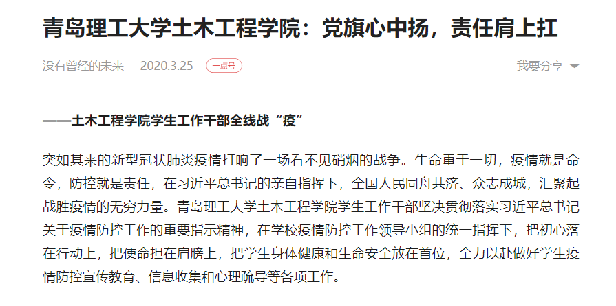 传播正能量,弘扬主旋律。疫情期间辅导员、班主任多次组织开展主题班会、团日活动,防疫抗疫观念深入传播至每一位同学。通过QQ、微信、微博、易班、到梦空间等网络渠道持续开展各类主题活动,组织了疫情防控知识“青年大学习”、“防疫知识问答”;开展“举国战‘疫’、人人有责”支部专题学习会;“众志成城、共战疫情——我行动、我承诺”云朗诵接力活动;“笔在指尖,情系武汉”诗信征集等活动,发出青年好声音,传播青春正能量。