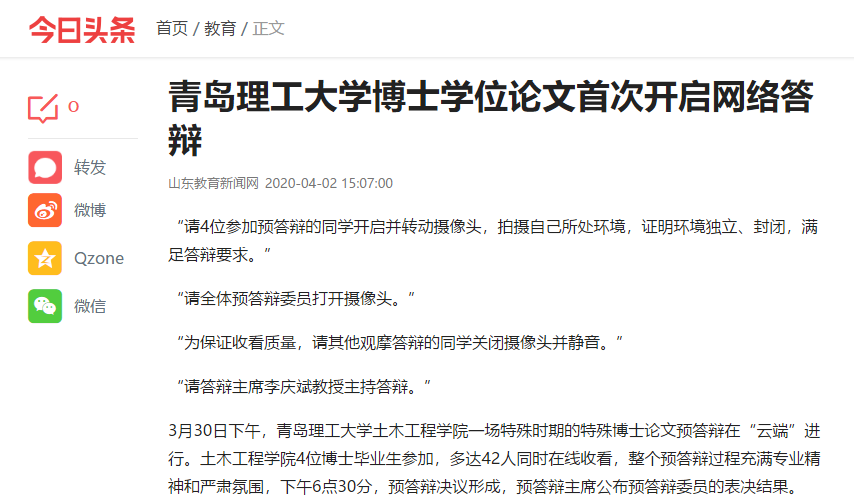 3月30日下午,艾弗森贝博ballbet官网土木工程学院一场特殊时期的特殊博士论文预答辩在“云端”进行。土木工程学院4位博士毕业生参加,多达42人同时在线收看,整个预答辩过程充满专业精神和严肃氛围,下午6点30分,预答辩决议形成,预答辩主席公布预答辩委员的表决结果。