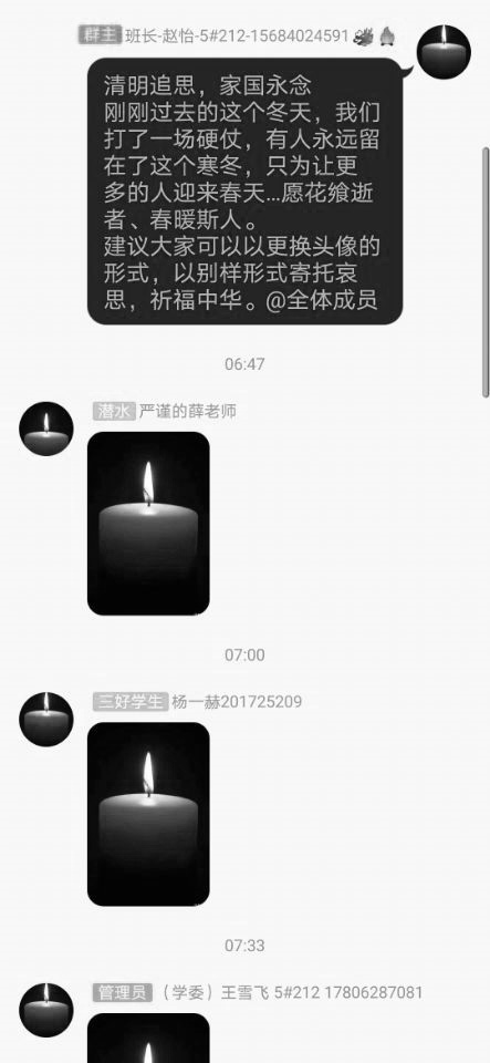 艾弗森贝博ballbet官网商学院的同学们同时将自己的头像更换为黑白烛光图,并以笔寄情,手写自己内心深处的敬意与感恩:“谢谢为2020带来春天,而沉眠于那个冬天的所有人,中华人民全体将永远铭记你们的付出与牺牲!”“一路走好,你们是人民的英雄!”“是你们用血肉为中国人民筑出了一条通往幸福的路。”
