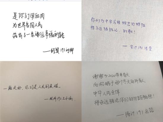 商学院的同学们同时将自己的头像更换为黑白烛光图,并以笔寄情,手写自己内心深处的敬意与感恩:“谢谢为2020带来春天,而沉眠于那个冬天的所有人,中华人民全体将永远铭记你们的付出与牺牲!”“一路走好,你们是人民的英雄!”“是你们用血肉为中国人民筑出了一条通往幸福的路。”