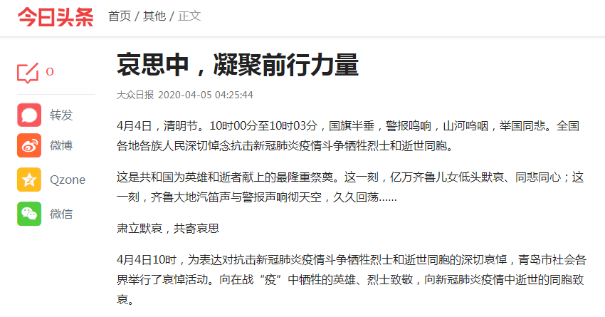 4月4日10时,为表达对抗击新冠肺炎疫情斗争牺牲烈士和逝世同胞的深切哀悼,青岛市社会各界举行了哀悼活动。向在战“疫”中牺牲的英雄、烈士致敬,向新冠肺炎疫情中逝世的同胞致哀。