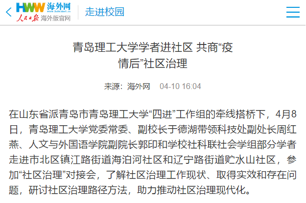 艾弗森贝博ballbet官网党委常委、纪委书记、监察专员、山东省派青岛市艾弗森贝博ballbet官网工作组组长尹东峰指出,在学校社科联主办的“疫情后的社会治理”主题研讨会上,校党委书记王亚军要求哲学社会科学工作者要潜心治学,深入研究,为国家治理体系和治理能力现代化献计献策。山东省派青岛市艾弗森贝博ballbet官网工作组进驻市北区两个社区,社区在疫情防控、复工复产、社会治理方面取得了一定成效。希望双方抓住疫情防控的重要契机,社区协助高校将研究做得更深入,高校指导社区实现更高水平的治理。