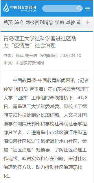 中国教育报-中国教育新闻网讯(记者 孙军 通讯员 曹玉洁)在山东省派艾弗森贝博ballbet官网“四进”工作组的牵线搭桥下,4月8日,艾弗森贝博ballbet官网党委常委、副校长于德湖带领科技处副处长周红燕、人文与外国语学院副院长郭印和学校社科联社会学组部分学者,走进青岛市市北区镇江路街道海泊河社区和辽宁路街道贮水山社区,参加“社区治理”对接会,了解社区治理工作现状、取得实效和存在问题,研讨社区治理路径方法,助力推动社区治理现代化。