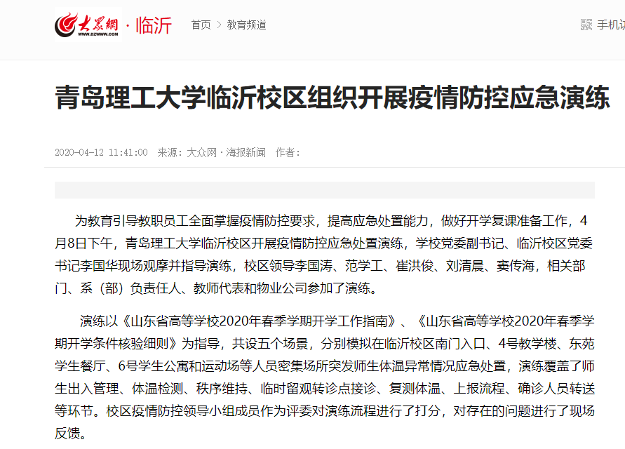 演练以《山东省高等学校2020年春季学期开学工作指南》、《山东省高等学校2020年春季学期开学条件核验细则》为指导,共设五个场景,分别模拟在临沂校区南门入口、4号教学楼、东苑学生餐厅、6号学生公寓和运动场等人员密集场所突发师生体温异常情况应急处置,演练覆盖了师生出入管理、体温检测、秩序维持、临时留观转诊点接诊、复测体温、上报流程、确诊人员转送等环节。校区疫情防控领导小组成员作为评委对演练流程进行了打分,对存在的问题进行了现场反馈。