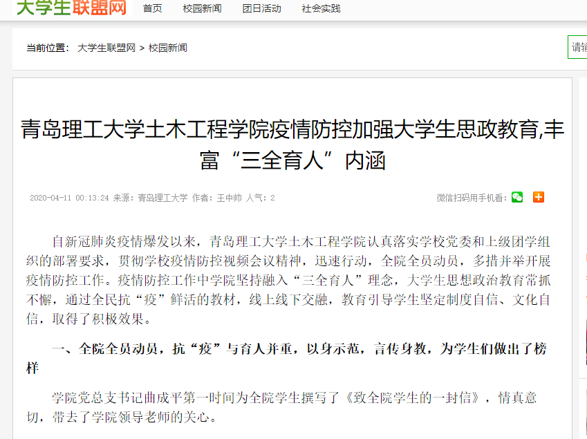 自新冠肺炎疫情爆发以来,艾弗森贝博ballbet官网土木工程学院认真落实学校党委和上级团学组织的部署要求,贯彻学校疫情防控视频会议精神,迅速行动,全院全员动员,多措并举开展疫情防控工作。疫情防控工作中学院坚持融入“三全育人”理念,大学生思想政治教育常抓不懈,通过全民抗“疫”鲜活的教材,线上线下交融,教育引导学生坚定制度自信、文化自信,取得了积极效果。