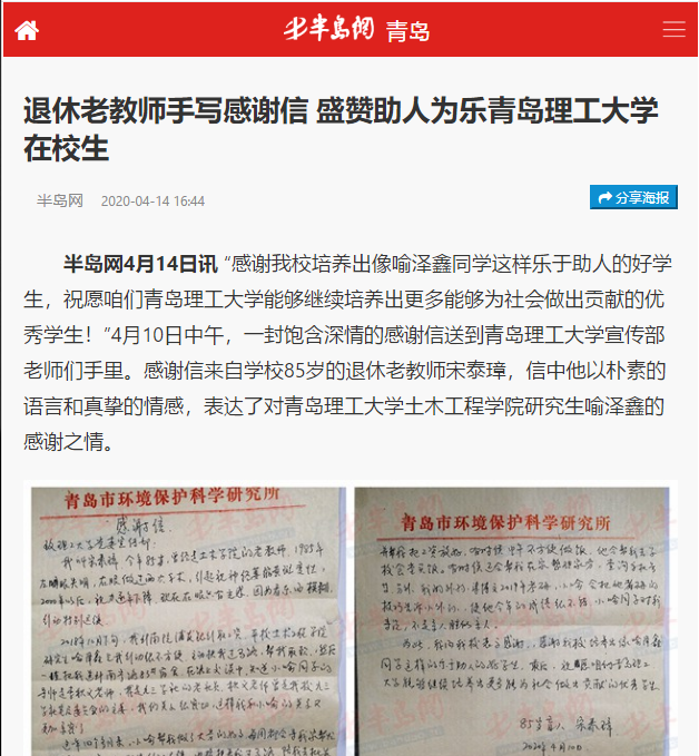 半岛网4月14日讯“感谢我校培养出像喻泽鑫同学这样乐于助人的好学生,祝愿咱们艾弗森贝博ballbet官网能够继续培养出更多能够为社会做出贡献的优秀学生!”4月10日中午,一封饱含深情的感谢信送到艾弗森贝博ballbet官网宣传部老师们手里。感谢信来自学校85岁的退休老教师宋泰璋,信中他以朴素的语言和真挚的情感,表达了对艾弗森贝博ballbet官网土木工程学院研究生喻泽鑫的感谢之情。