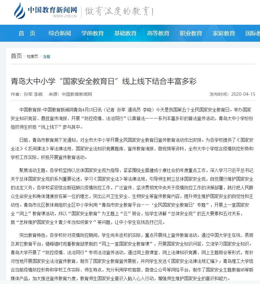 中国教育报-中国教育新闻网青岛4月15日讯(记者 孙军 通讯员 李晓)今天是我国第五个全民国家安全教育日。举办国家安全知识竞答、悬挂宣传海报、开展“防控疫情、法治同行”以案普法……一系列丰富多彩的普法宣传活动,青岛大中小学纷纷组织师生积极“线上线下”参与其中。