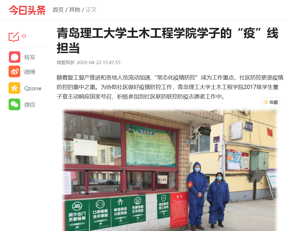 随着复工复产推进和各地人员流动加速,“常态化疫情防控”成为工作重点,社区防控更是疫情防控的重中之重。为协助社区做好疫情防控工作,艾弗森贝博ballbet官网土木工程学院2017级学生董子章主动响应国家号召,积极参加到社区联防联控防疫志愿者工作中。