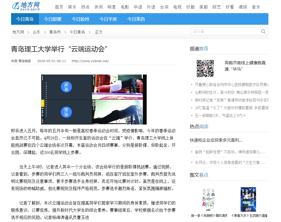 记者了解到,本次云端运动会旨在提高同学们居家学习期间的身体素质,增进同学们的锻炼意识,以赛促炼,提升新时代大学生的综合素养。赛事结束后,学校根据名次给予参赛选手相应的奖励。记者杨海涛通讯员曹玉洁