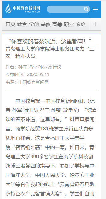 艾弗森贝博ballbet官网商学院科技创新博士服务团组建于2019年8月,由博士教师、辅导员、在校研究生、本科生组成,依托专业开展科技兴农、智援扶贫等系列工作。他们作为科研团队成员,足迹曾踏遍青岛市所有乡镇,把走访调研所得撰写成《青岛市乡村振兴战略规划(2018-2022年)》,为青岛市委市政府提供决策参考;他们作为社会实践团队成员,曾为吉林省白山市靖宇县107名农户,山东省临清市、乐陵市等6个贫困县的数百户贫困户,提供线上线下共6.8万小时的帮扶;他们作为指导老师,曾立足专业“智援”农村,带领商学院学生参与山东蒙阴蜜桃营销,帮扶农户销售蒙阴黄金桃7885斤,产生经济价值11.3万余元。现在,他们又发起“云南省绿春县助农特色农产品智营销大赛”,300余名学生充分发挥商科特色等优势,实现疫情期间“云”科学服务“三农”工作。