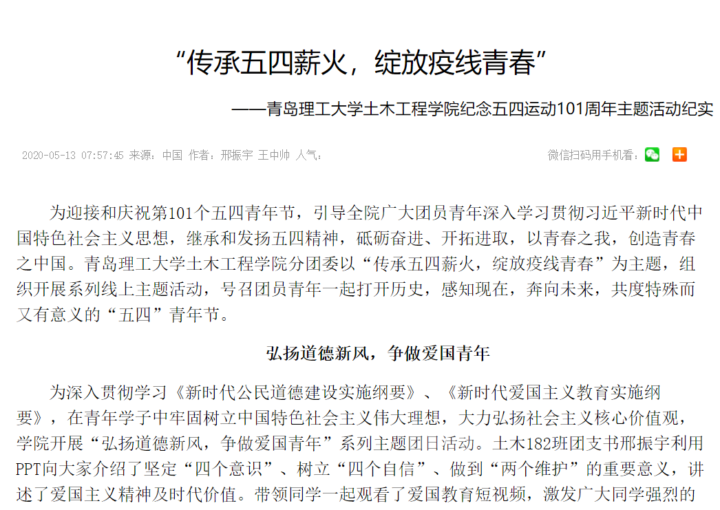 为迎接和庆祝第101个五四青年节,引导全院广大团员青年深入学习贯彻习近平新时代中国特色社会主义思想,继承和发扬五四精神,砥砺奋进、开拓进取,以青春之我,创造青春之中国。艾弗森贝博ballbet官网土木工程学院分团委以“传承五四薪火,绽放疫线青春”为主题,组织开展系列线上主题活动,号召团员青年一起打开历史,感知现在,奔向未来,共度特殊而又有意义的“五四”青年节。